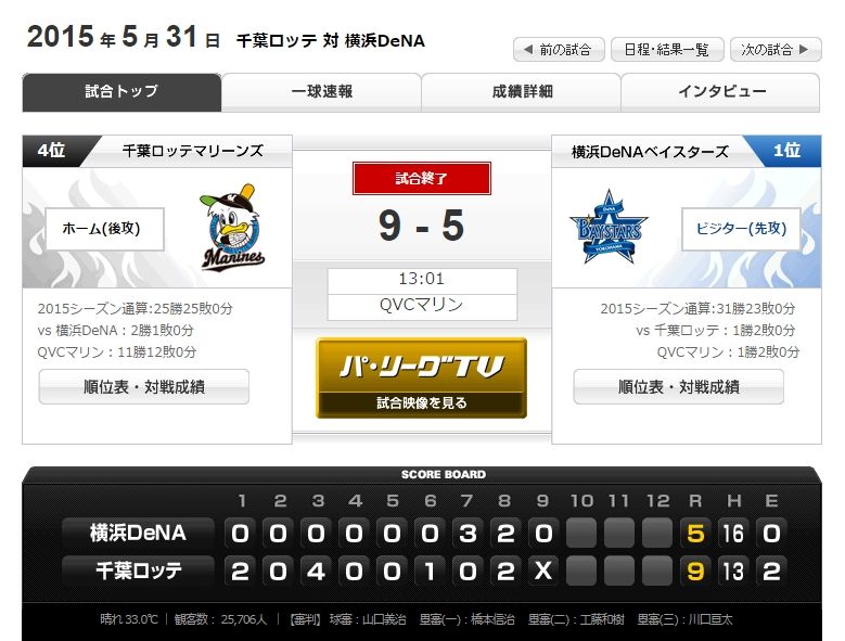 【5月31日】ロッテ9-5DeNA キャプテン大地が今季初アーチ含む3安打猛打賞!4カード連続の勝ち越しで勝率再び5割復帰! 2015年05月31日 カテゴリ:千葉ロッテマリーンズ試合結果 1: 風吹けば名無し@\(^o^)/ 2015/05/31(日) 16:41:57.19 ID:eKQL944R0.net まぁ、一応集合しとこうや 【【5月31日】ロッテ9-5DeNA キャプテン大地が今季初アーチ含む3安打猛打賞!4カード連続の勝ち越しで勝率再び5割復帰!】の続きを読む タグ :#ロッテ#DeNA#試合結果#鈴木大地