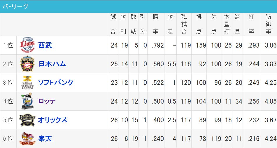 4/30 パ・リーグ順位表!ロッテが連勝で勝率5割復帰!西武が早くも20勝にリーチ 2018年04月30日 カテゴリ:パ・リーグ順位(予想) 9: 風吹けば名無し@\(^o^)/ 2018/04/30(月) 17:18:48.31 ID:P4UYqn17a 猫と鷲は13.5差? 【4/30 パ・リーグ順位表!ロッテが連勝で勝率5割復帰!西武が早くも20勝にリーチ】の続きを読む