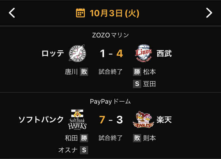 10月3日 ロッテ1-4西武 先発唐川が3回2失点、打線は毎回走者を出すも得点奪えず岡の一発のみで終わり4連勝ならず