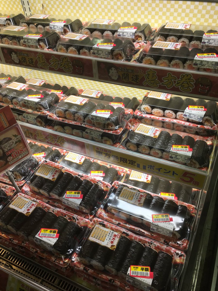 22時ごろイオン行ったら30円になった恵方巻きが並べられてた