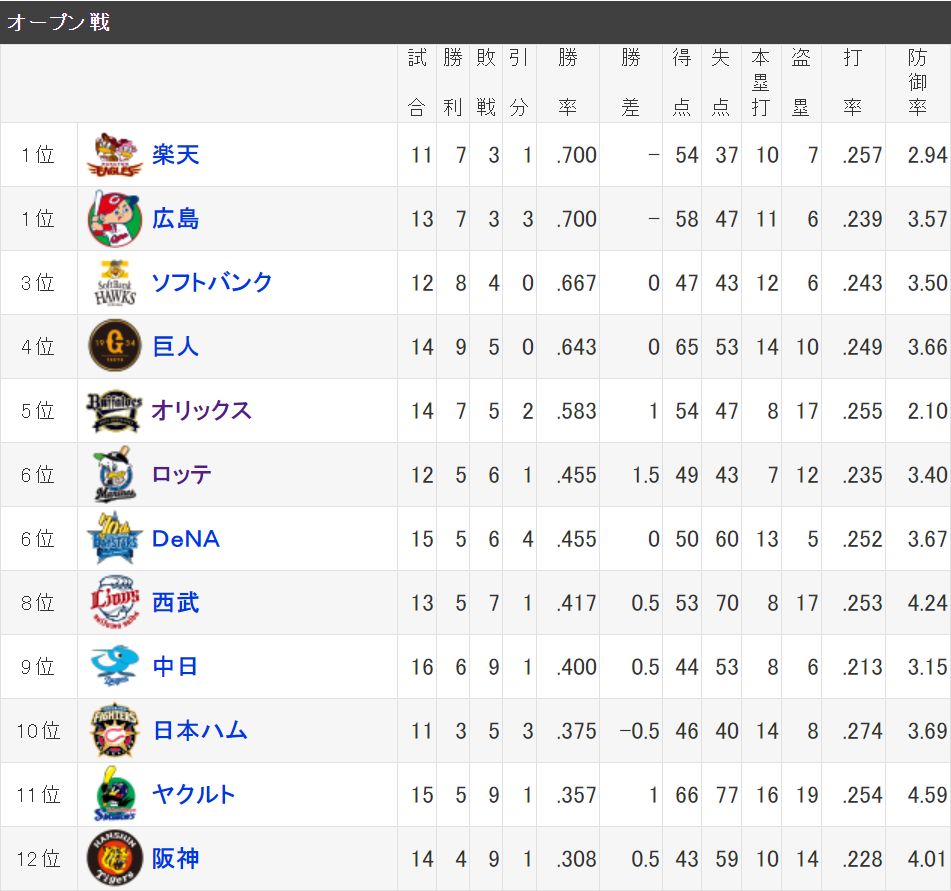 オープン戦最下位→リーグ最終順位