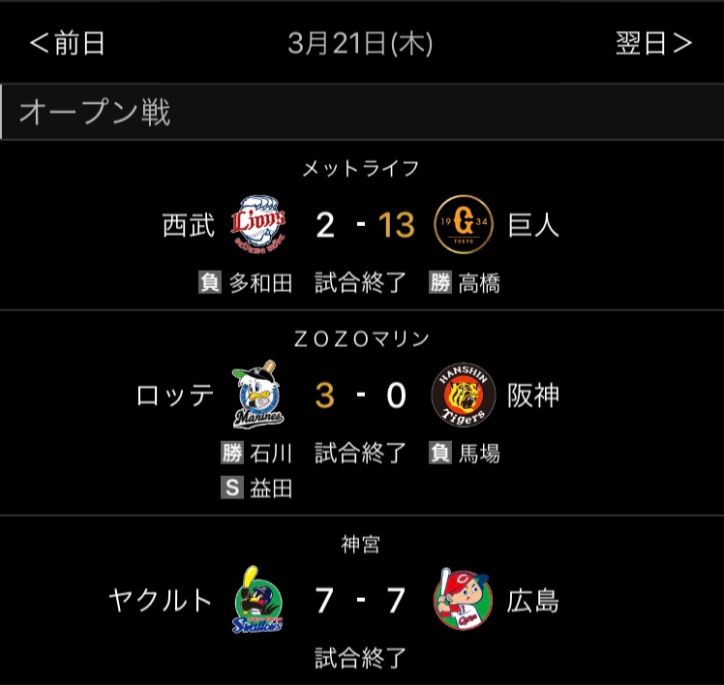 まぁとりあえずマリンで勝てたし、巨人との2戦はわりとガチるやろうから貯金作ってオープン戦フィニッシュしたいな