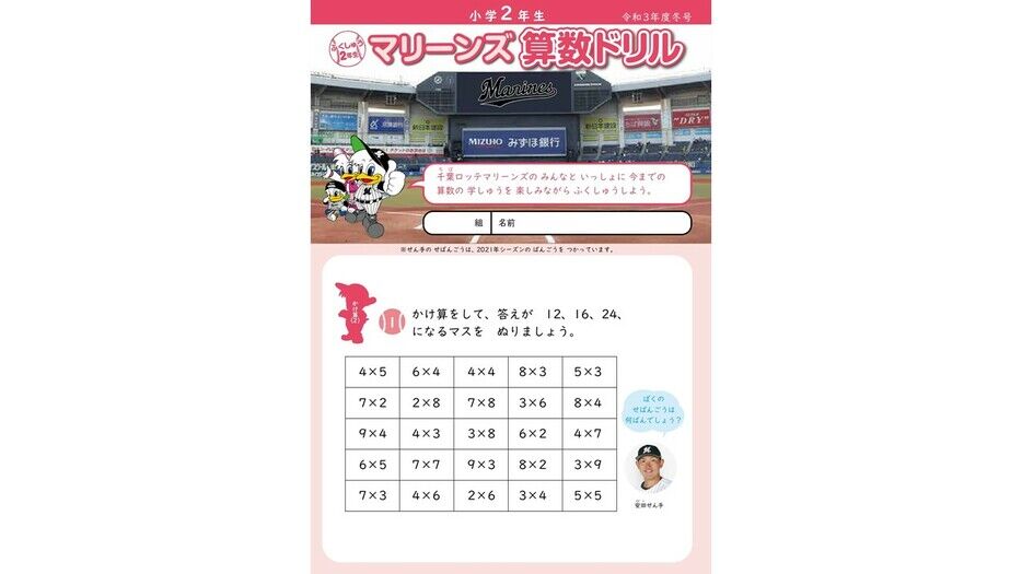 ロッテは20日、マリーンズ算数ドリル令和3年度冬号を発行し千葉市内の公立小学校109校に無償で配布したことを発表した。