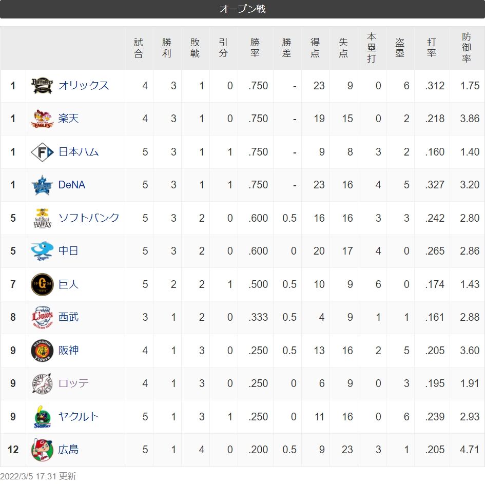 5 中日 05試合 3勝 2敗 0分 .600 得点20 失点17 本04 盗00 率.265 防2.86 失04