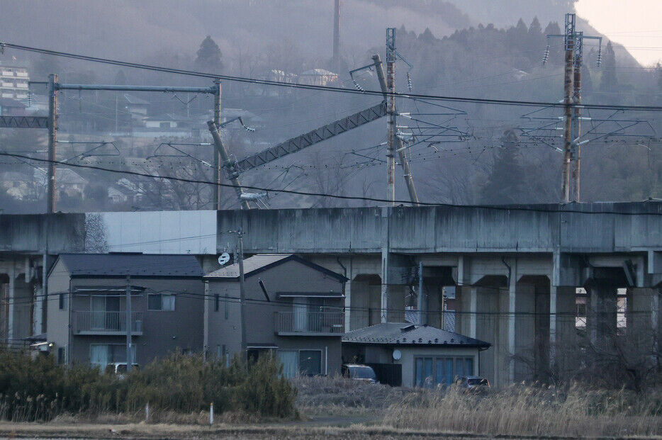 福島県沖を震源とする最大震度6強を観測した地震の影響で脱線した東北新幹線の車両です。宮城・福島の被害状況は【写真まとめ】https://t.co/B8XCvemgQf でもご覧になれます。(さ)#震度6強 #新幹線脱線 pic.twitter.com/cjreoF20kW
