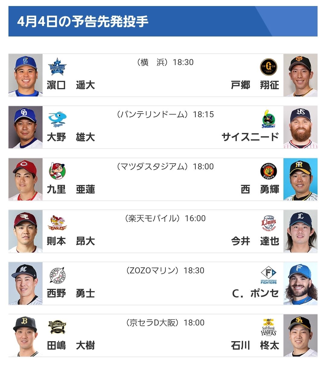 4/4(火)の予告先発