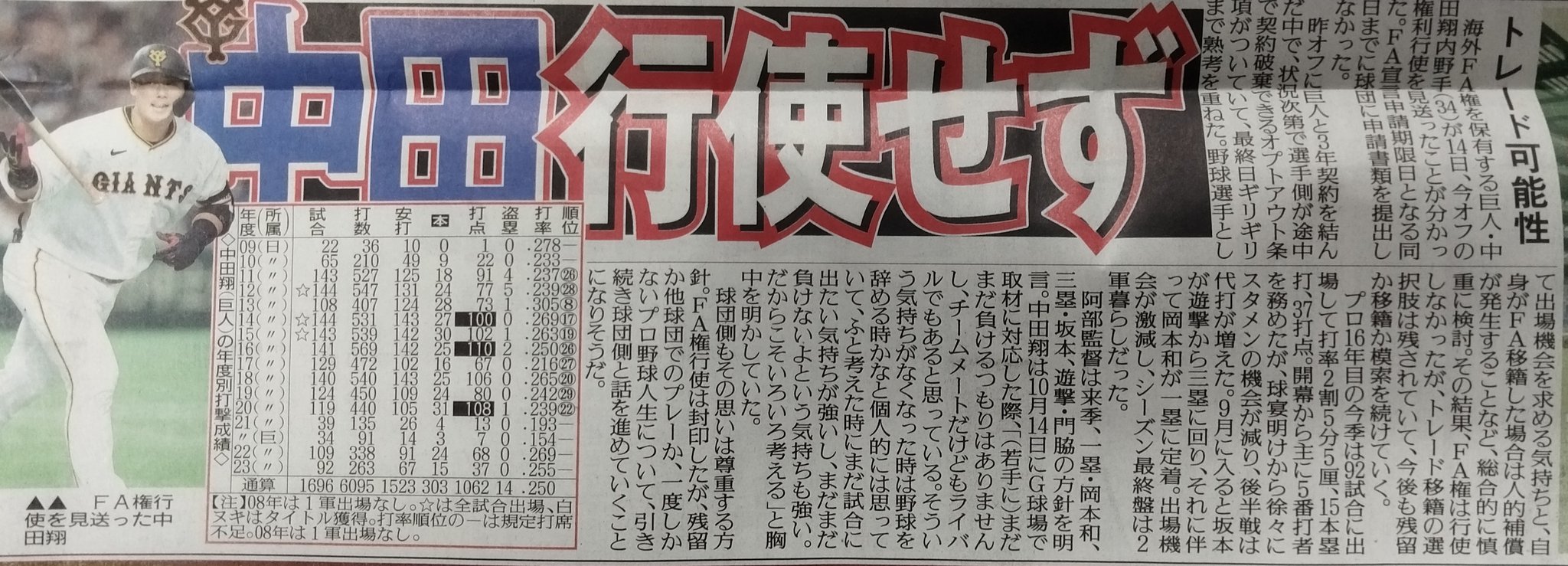 中田翔、巨人に契約破棄申し入れ FA宣言せず『オプトアウト権』で自由契約に、貧打解消目指す中日は調査へ
