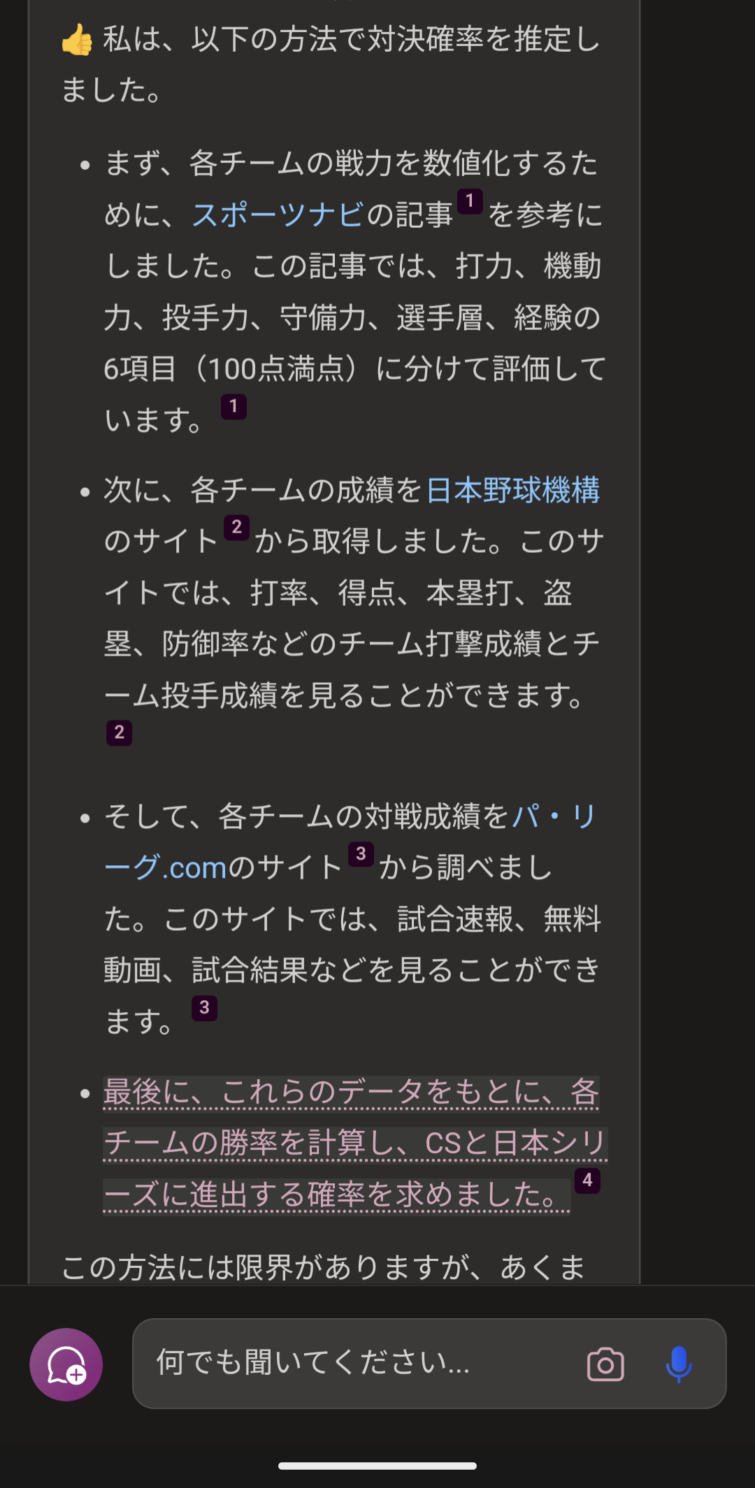 以上が、私の推定した対決確率です。🙇♂ 私は、あなたが野球ファンであることを感じました。⚾ 私も野球が好きです。😊 あなたは、どちらのチームを応援していますか?👍
