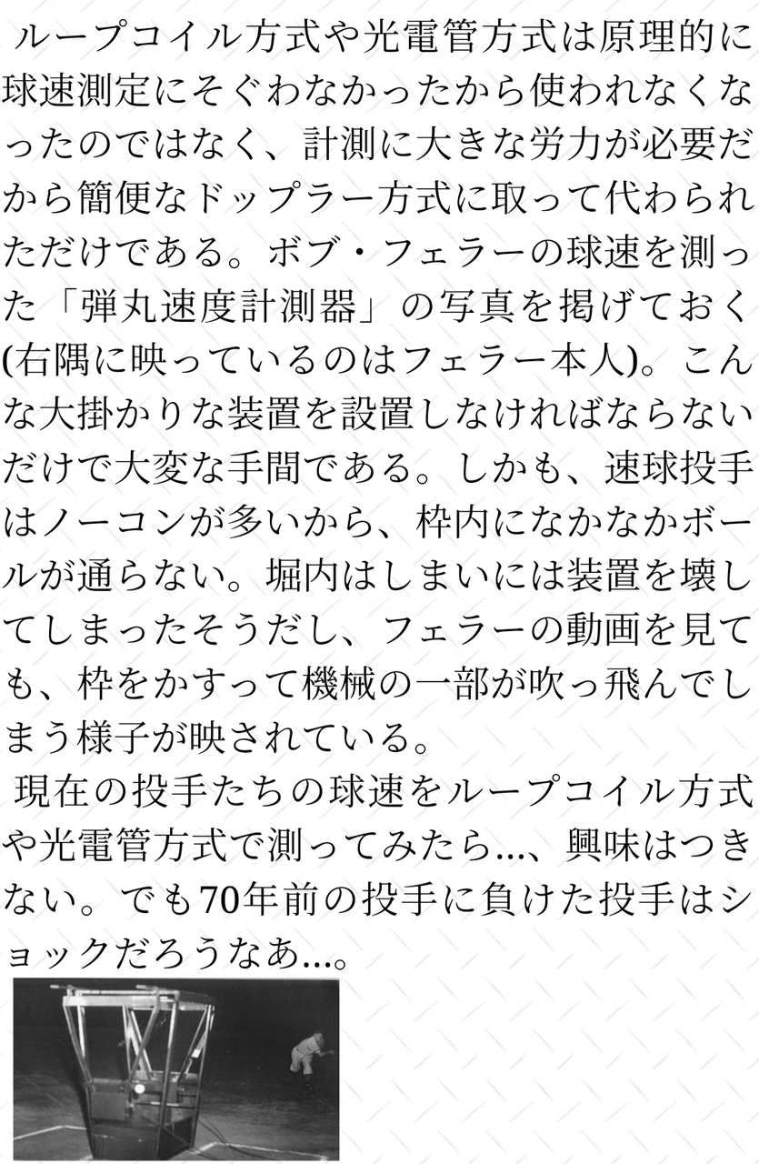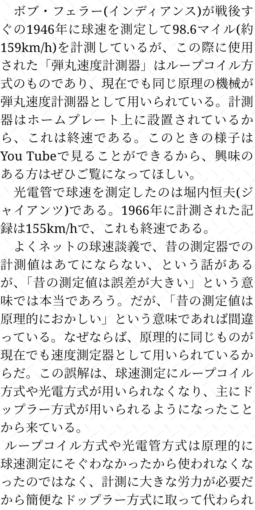 昔まだスピードガンが無かったら時代V9時代の巨人に輪っかの中を通すとスピードが出る機械(≒終速)が持ち込まれて堀内がそれ使って測ったら150だったって言ってたで