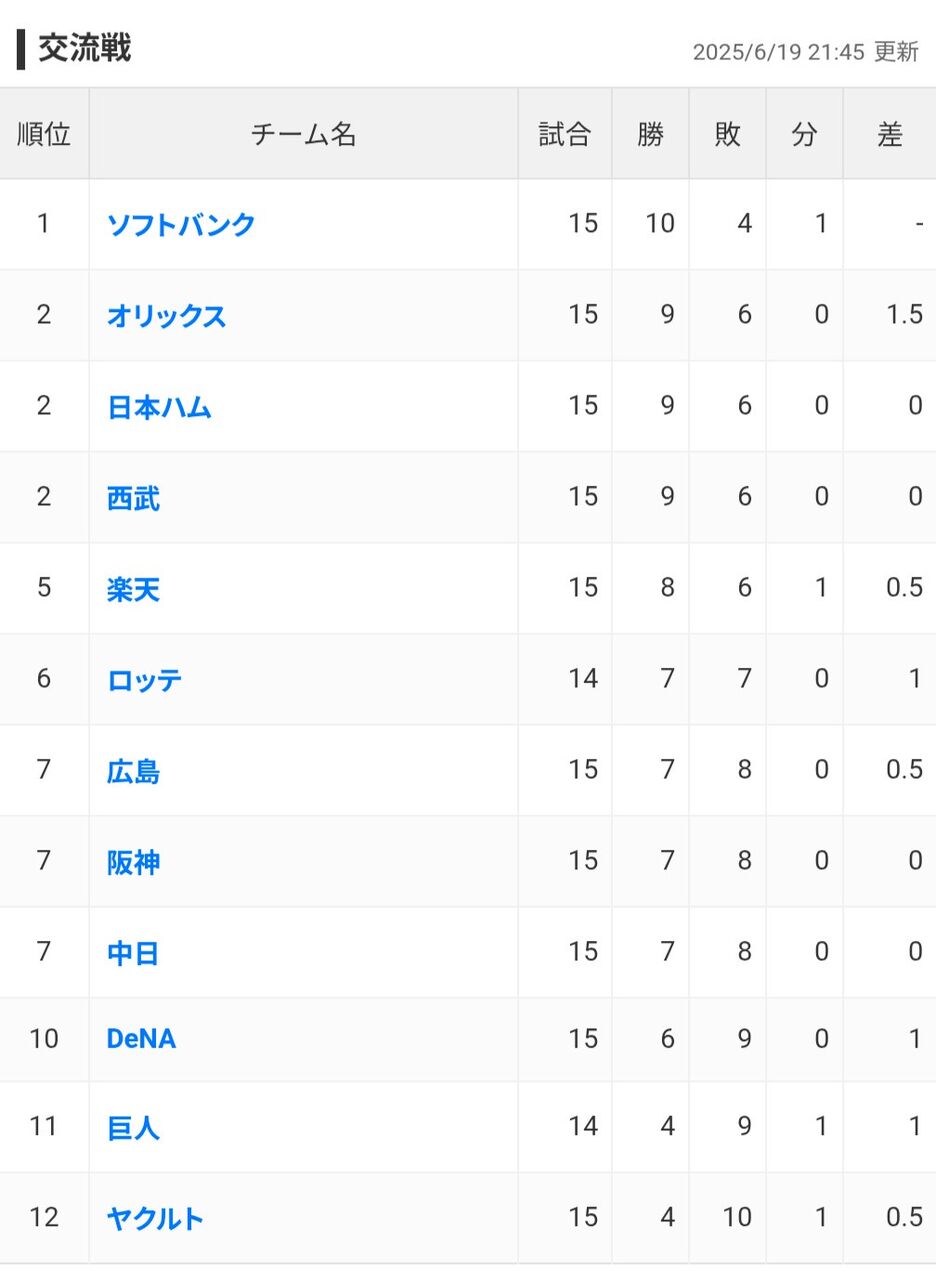 ロッテとヤクルトが各リーグ内で余分に負けただけでマジで意味の無い交流戦やったな