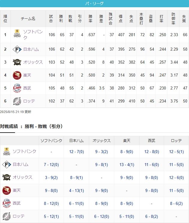 そらソフトバンクが残り19勝18敗で行ったらハムは24勝13敗しないと上回れないからな