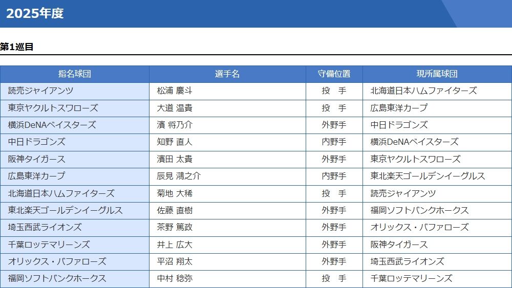 楽天はソフトバンクの佐藤直樹外野手(27)、西武はオリックスの茶野篤政外野手(26)、オリックスは西武の平沼翔太外野手(28)、阪神はヤクルトの浜田太貴外野手(25)を獲得した。