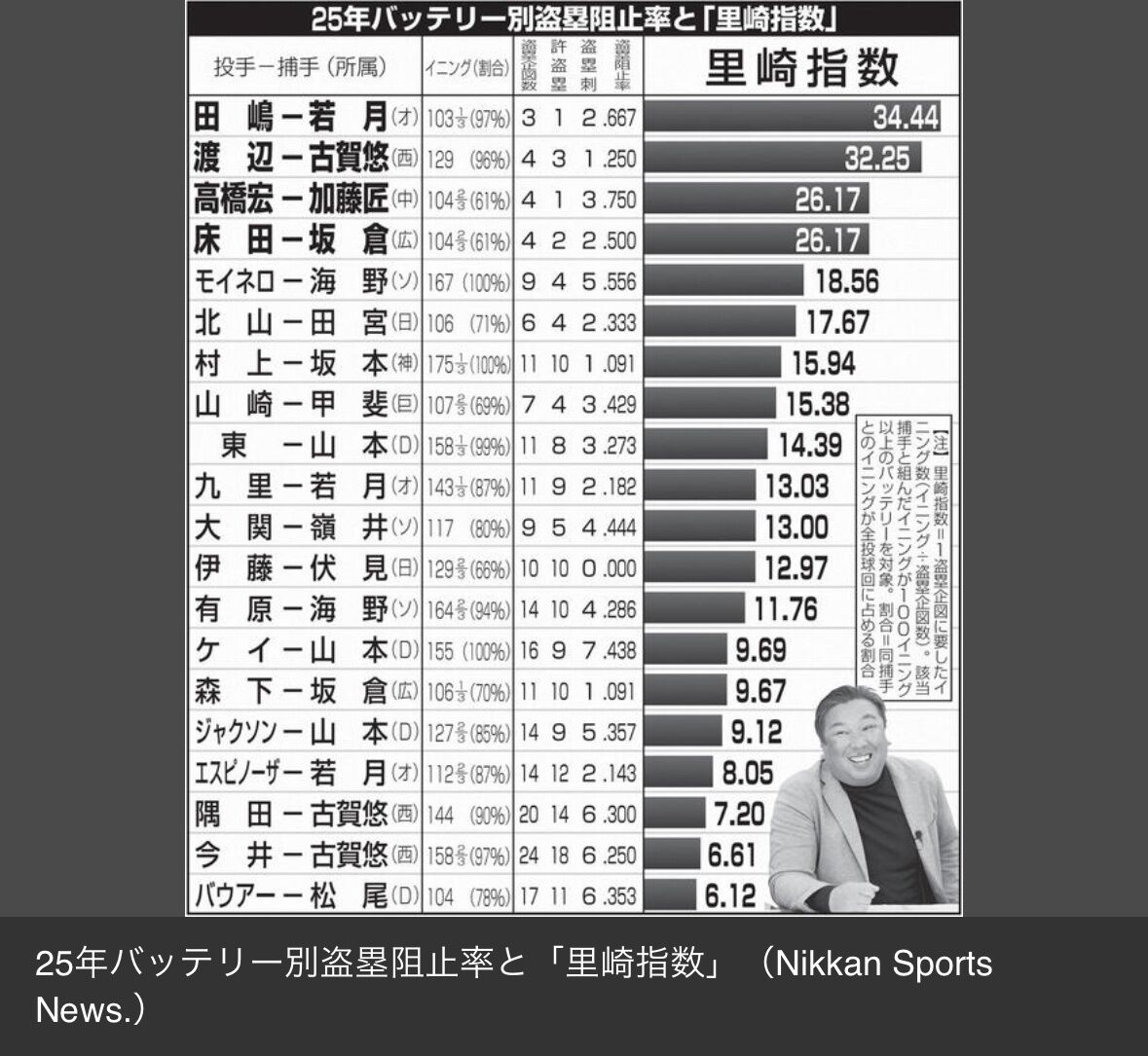 今年の里崎指数を見ると、田嶋大樹-若月健矢(オリックス)の34・44がトップ。およそ34イニングに1盗塁チャレンジという計算になる。先発完投はめっきり減ったが、完投と仮定しても4試合で1盗塁企図。これは若月の注意喚起と、田嶋のけん制、クイックがいかに走者にとって脅威だったかが分かる。