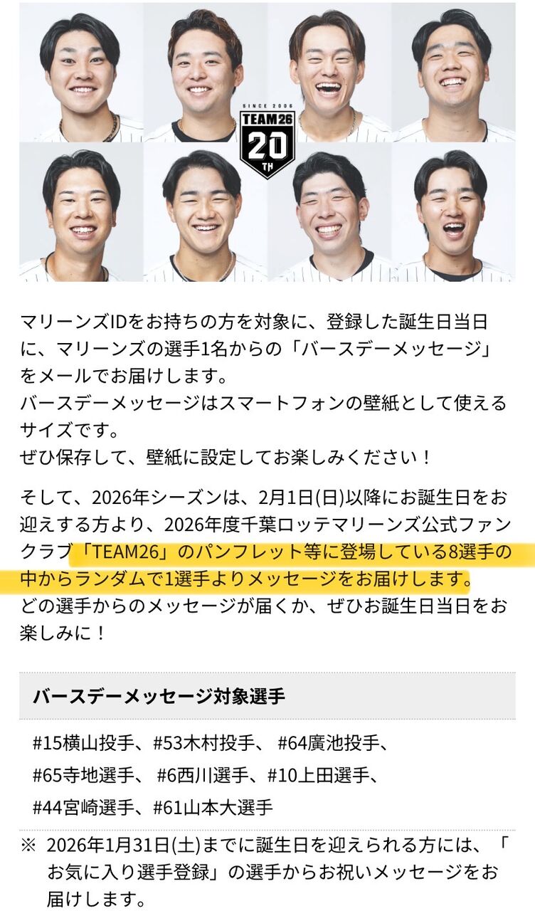 マリーンズIDをお持ちの方を対象に、お誕生日当日にマリーンズの選手1名からの「バースデーメッセージ」をメールでお届けします。