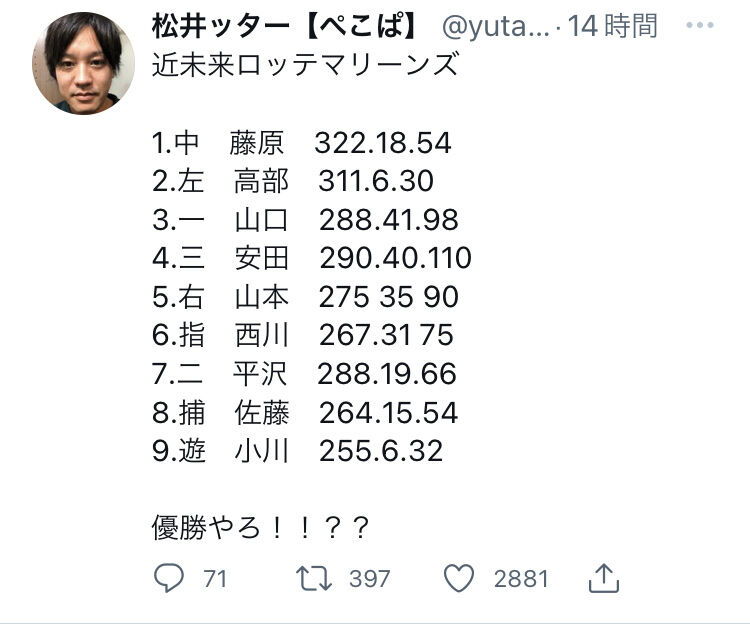俺がゲーム使ってたペナントのロッテのクリーンナップ載せとくから落ち着け。