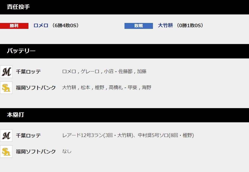 6月27日 ソフトバンク1-8ロッテ 先発ロメロが7回無失点の快投!レアード・中村奨の一発など二桁安打の猛攻で快勝し連勝! 2022年06月27日 カテゴリ:千葉ロッテマリーンズ試合結果 1: それでも動く名無し 2022/06/27(月) 21:15:08.28 ID:GVweQ+xM0 サンキューロメロ 本拠地ドームにしろ 【6月27日 ソフトバンク1-8ロッテ 先発ロメロが7回無失点の快投!レアード・中村奨の一発など二桁安打の猛攻で快勝し連勝!】の続きを読む タグ :#ロッテ#ソフトバンク#試合結果#chibalotte#エンニー・ロメロ#レアード