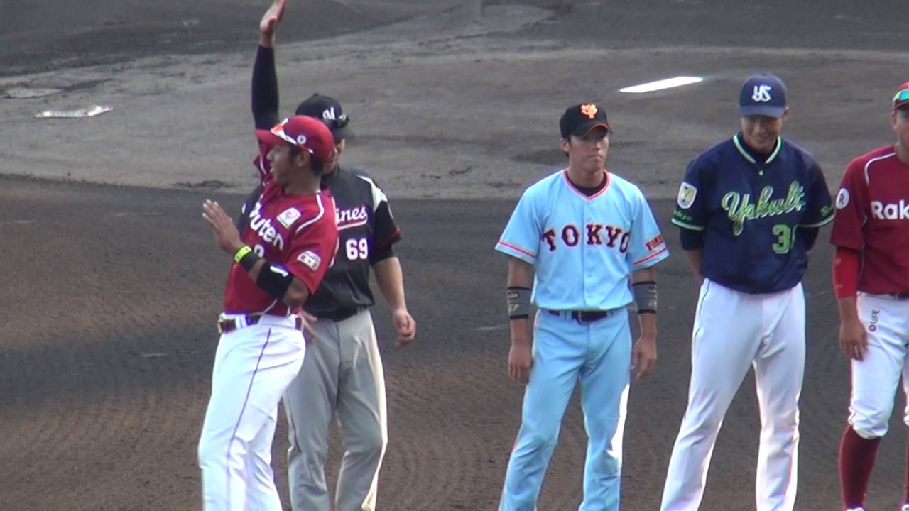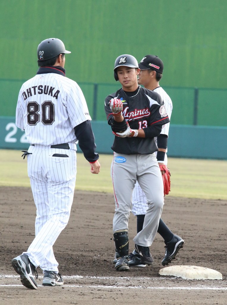 梨田昌孝監督とタッチを交わすオコエ。この1年間多くの楽天ファンを沸かせてきた、そのスター性は本物だ。 photograph by Kyodo News