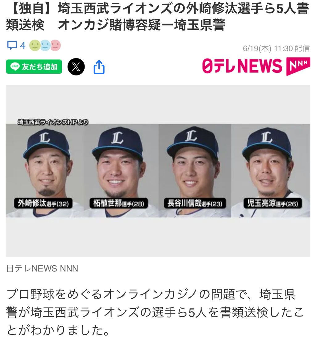 オンカジ問題、5人書類送検で名前が発覚する 2025年06月19日 カテゴリ:その他テーマ 3: 名無しさん 2025/06/19(木) 11:35:05.971 ID:jcOBJF.U6 【独自】埼玉西武ライオンズの外崎修汰選手ら5人書類送検 オンカジ賭博容疑ー埼玉県警 24: 名無しさん 2025/06/19(木) 11:35:54.335 ID:jUb1U6U39 >捜査関係者によりますと、埼玉県警が賭博の疑いで19日に書類送検したのは、埼玉西武ライオンズの外崎修汰選手(32)、柘植世那選手(28)、長谷川信哉選手(23)、児玉亮涼選手(26)4人と男性職員1人です。 【オンカジ問題、5人書類送検で名前が発覚する】の続きを読む タグ :#オンカジ