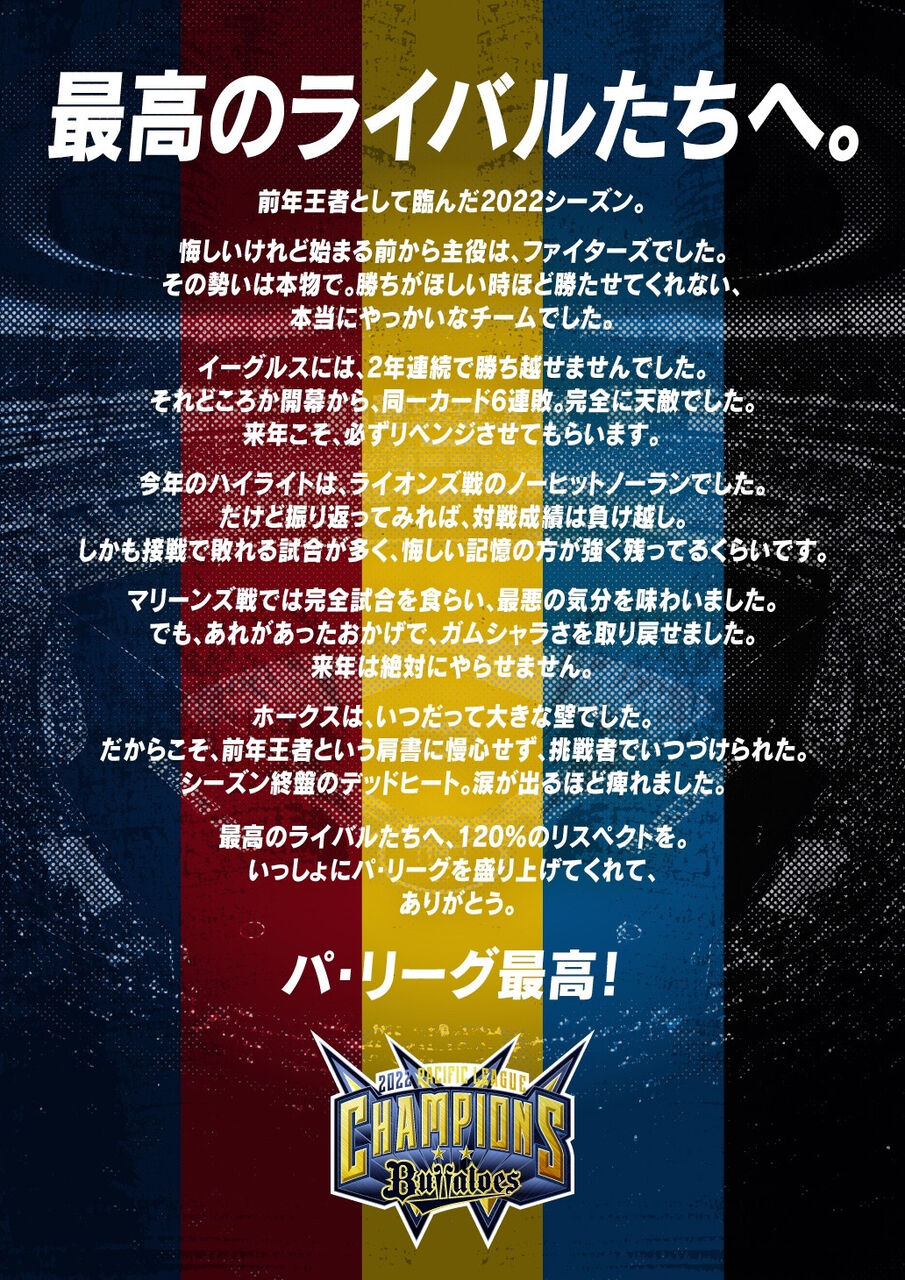 パ・リーグ最高!#Bs2022 #プロ野球 #NPB #ORIX pic.twitter.com/Nfh216Jf9F