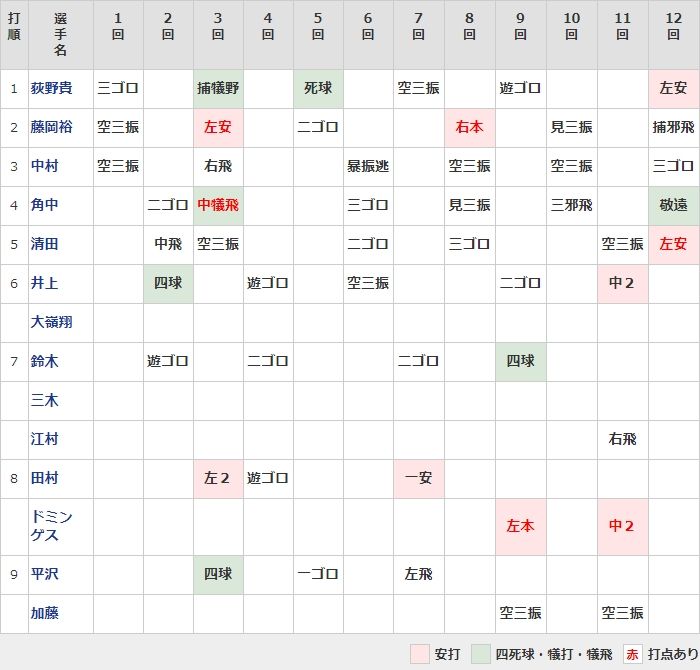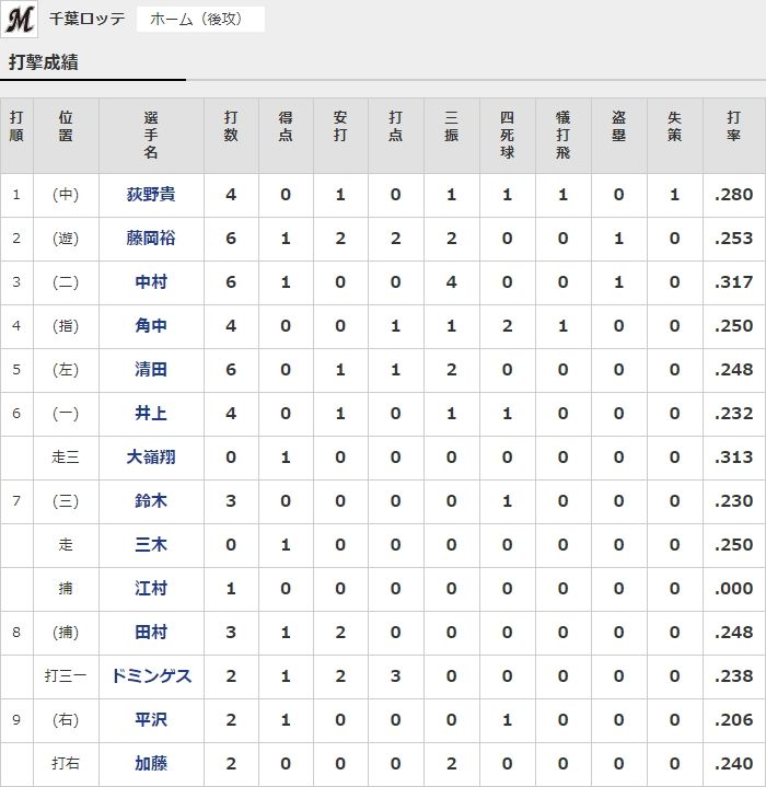 ロッテ・ドミンゲス.238(21打数5安打) 3本 8打点 OPS.987