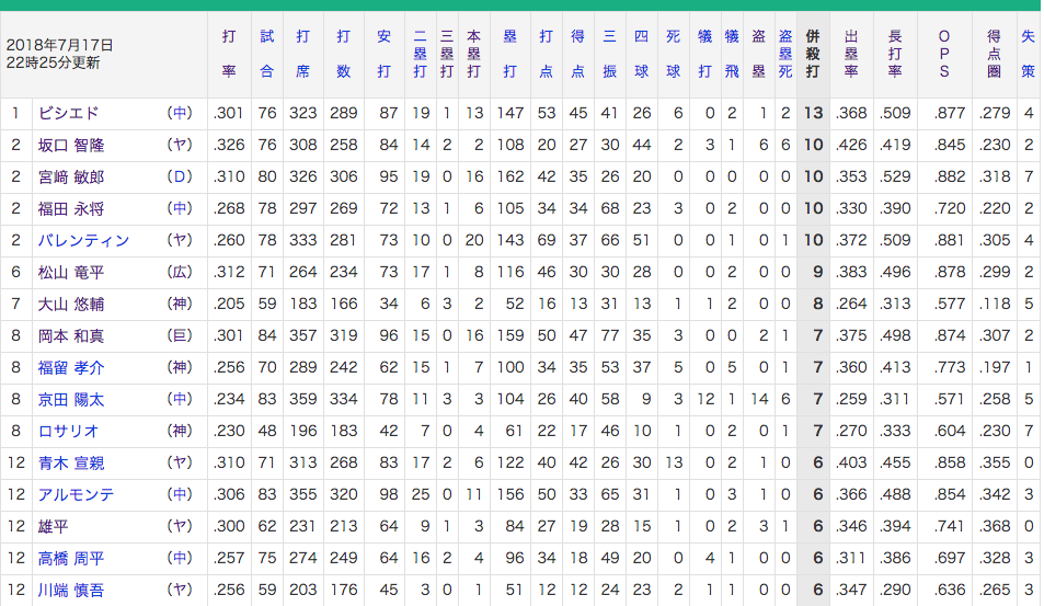 2018年シーズン併殺打数ランキングwww 2018年07月18日 カテゴリ:成績・歴代記録ランキング 1: 風吹けば名無し@\(^o^)/ 2018/07/17(火) 22:22:18.66 ID:LnGL5t4kM セ 1 ビシエド 13 2 坂口 智隆 10 2 宮﨑 敏郎 10 2 福田 永将 10 2 バレンティン 10 6 松山 竜平 9 7 大山 悠輔 8 8 岡本 和真 7 8 福留 孝介 7 8 京田 陽太 7 8 ロサリオ 7 【2018年シーズン併殺打数ランキングwww】の続きを読む タグ :#併殺打#ゲッツー#大山悠輔#ロサリオ#京田陽太#中田翔#宮﨑敏郎#坂口智隆#福田永将