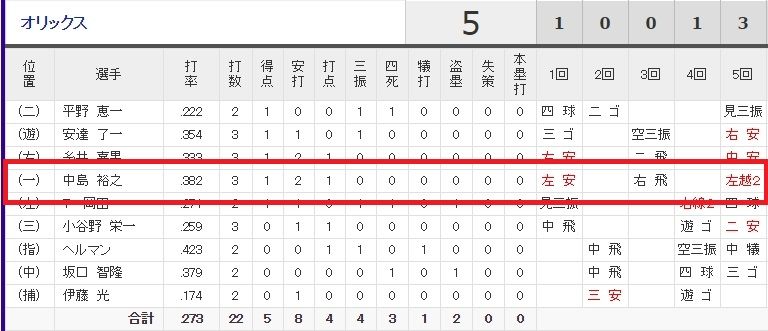 5 (一) 中島 4 3 2 0 .296 0 遊ゴ - - 左安 - 一安 中安