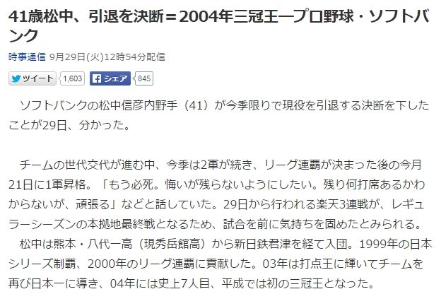 引退は誤報だった…Yahoo!JAPAN、松中引退記事を削除 2015年09月29日 カテゴリ:福岡ソフトバンクホークス契約更改・入団・解雇etc 1: 風吹けば名無し@\(^o^)/ 2015/09/29(火) 14:47:32.61 ID:EdrB31WerNIKU.net 一体どうした? 【引退は誤報だった…Yahoo!JAPAN、松中引退記事を削除】の続きを読む タグ :#松中信彦#引退#誤報#自由契約