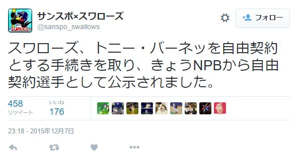 トニー・バーネッ自由契約 2015年12月08日 カテゴリ:東京ヤクルトスワローズ 1: 風吹けば名無し@\(^o^)/ 2015/12/08(火) 16:21:40.66 ID:qSrj/tgy0.net スワローズ、トニー・バーネッを自由契約とする手続きを取り、きょうNPBから自由契約選手として公示されました。 https://twitter.com/sanspo_swallows/status/674125826263265280 【トニー・バーネッ自由契約】の続きを読む タグ :#ヤクルト#バーネット#自由契約#誤植