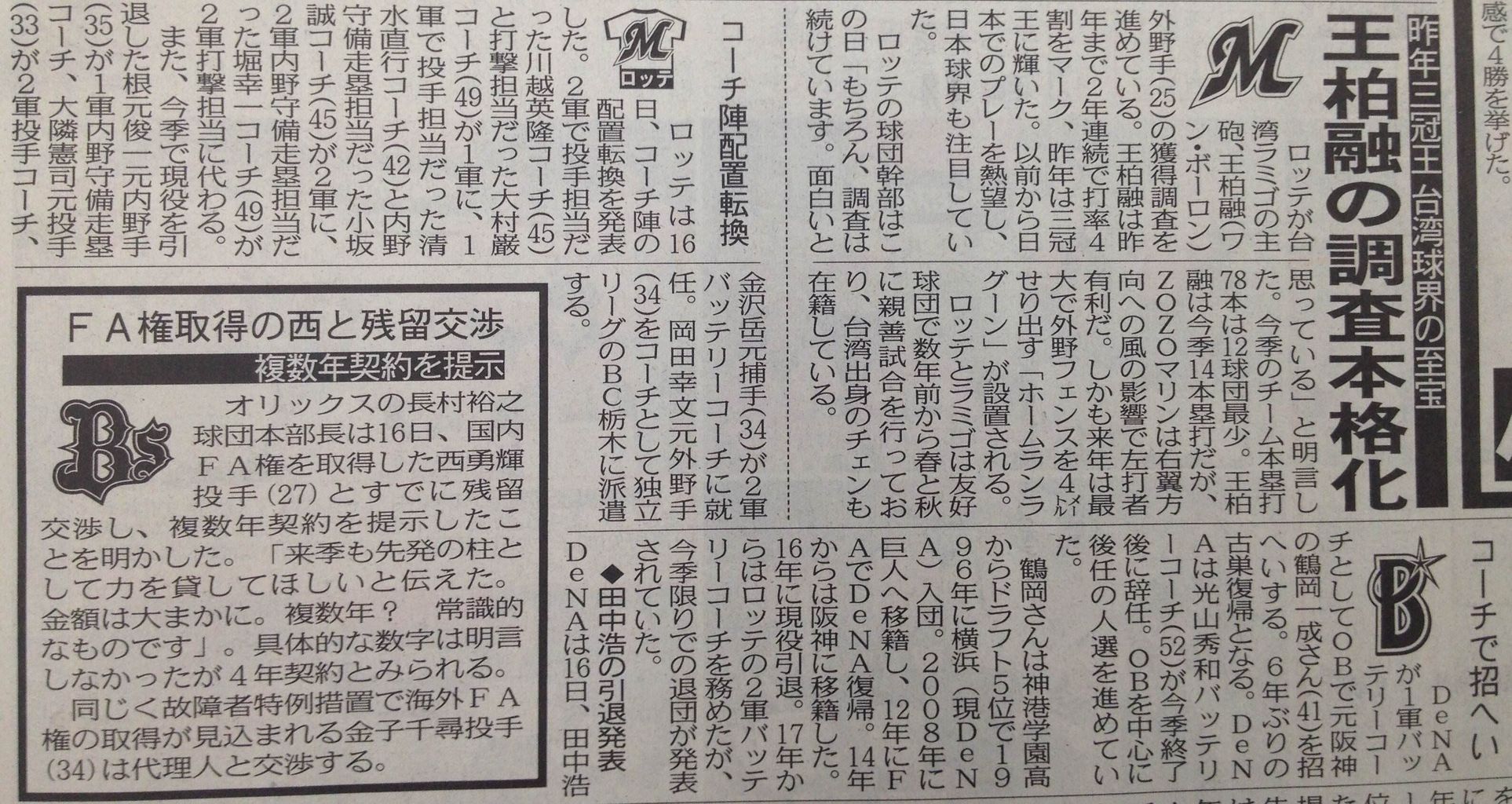 ロッテ、阪神引退の鶴岡一成氏を2軍コーチ招へいへ 2016年12月07日 カテゴリ:千葉ロッテマリーンズ監督・コーチ 1: 風吹けば名無し@\(^o^)/ 2016/12/07(水) 07:04:50.12 ID:9TWQ1/C+0 ロッテが来季の2軍バッテリーコーチに、今季限りで引退した前阪神の鶴岡一成捕手(39)を招く方針であることが6日、分かった。 http://headlines.yahoo.co.jp/hl?a=20161207-01748387-nksports-base 【ロッテ、阪神引退の鶴岡一成氏を2軍コーチ招へいへ】の続きを読む タグ :#ロッテ#鶴岡一成#招聘