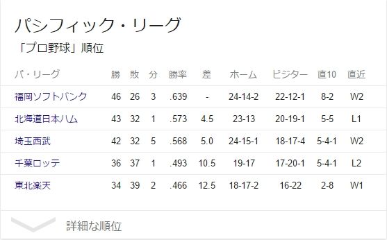 Googleで「パリーグ 順位表」で検索した結果がひどい 2015年07月06日 カテゴリ:順位(予想) 1: 風吹けば名無し@\(^o^)/ 2015/07/06(月) 06:42:14.24 ID:IkFUiK2g0.net パ・リーグ 勝 敗 分 勝率 差 ホーム ビジター 直近 福岡ソフトバンク 46 26 3 0.639 - 24-14-2 22-12-1 W2 北海道日本ハム 43 32 1 0.573 4.5 23-13 20-19-1 L1 埼玉西武 42 32 5 0.568 5 24-15-1 18-17-4 W2 千葉ロッテ 36 37 1 0.493 10.5 19-17 17-20-1 L2 東北楽天 34 39 2 0.466 12.5 18-17-2 16-22 W1 【Googleで「パリーグ 順位表」で検索した結果がひどい】の続きを読む タグ :#Google#検索結果